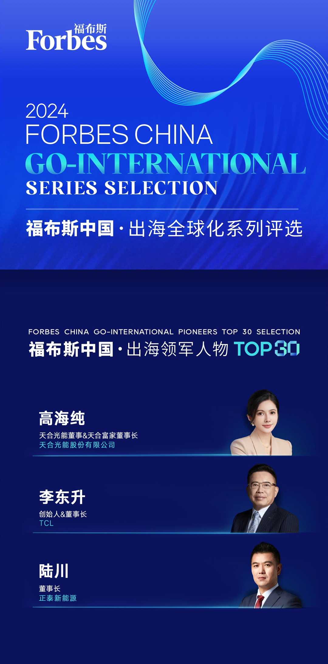 11月21日,2024福布斯中国·出海全球化系列评选颁奖典礼在厦门盛大举行。天合光能董事、天合富家董事长高海纯荣登“出海全球化领军人物TOP 30”榜单,表彰其在推动天合光能全球化进程中发挥的关键作用,同时也是对天合光能全球化战略和国际影响力的高度认可。