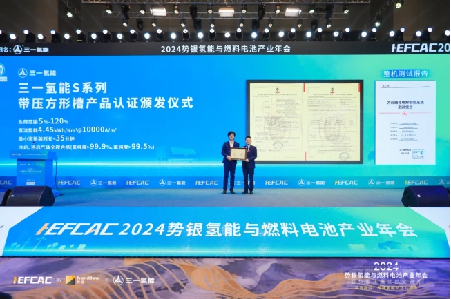 近日,在三一氢能3+1全系列新品发布会上,国际权威认证机构——法国必维集团,由其电力及工业部总经理叶炯先生亲自授予三一氢能全球首张带压方形碱性槽认证书。