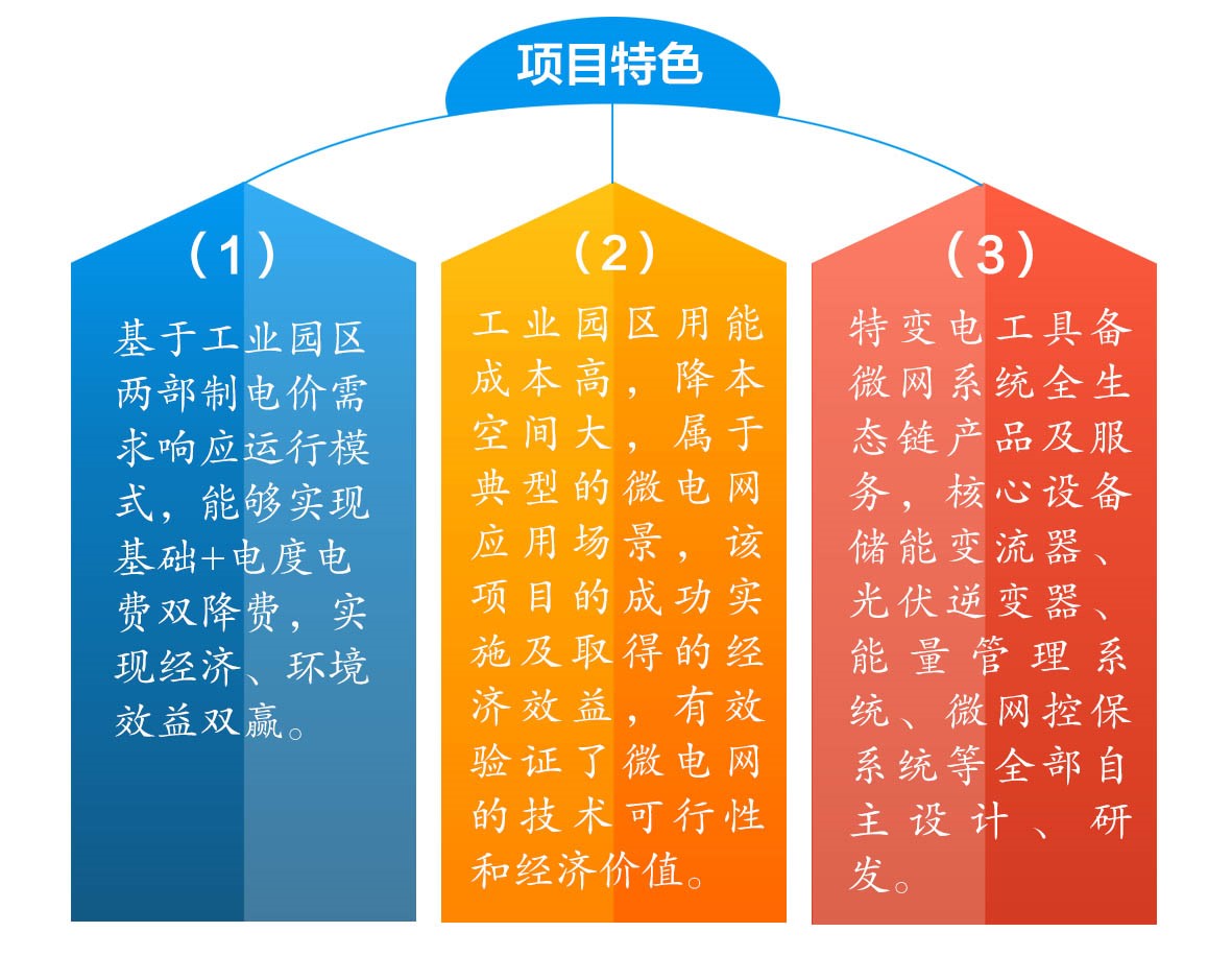 特变电工西安产业园2MW源网荷储协调微网示范工程,依托于国家高技术研究发展计划(863计划)“光伏微电网双向变流器研制及关键技术研究”项目,建设商业化运营的光储充电站。其中光伏组件配置2.14MWp,储能配置1MW/1MWh磷酸铁锂电池,同时配备有960kW电动汽车充电桩。该示范项目首次在工业园区微网中引入基于两部制电价的需求响应技术及经济优化调度算法,可实现“基础电费+电度电费”双重降费,通过构建光储充微网系统,搭配“智慧大脑”能量管理系统,协调控制源网荷储,智能优化调度园区用能,致力于为工业园区提供高可靠、低成本供电服务。