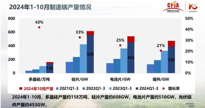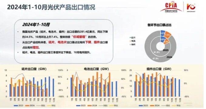 同时,他表示,2024年1-10月我国光伏产品(硅片、电池片、组件)出口总额约281.4亿美元,同比下降约34.5%。从出口产品结构来看,硅片、电池片出口额占比有所下降,组件出口额占比有所增加。硅片、电池、组件出口量三季度环比下降后,10月有所回升。