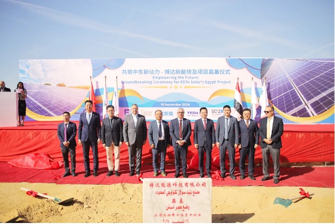 2024年12月16日,埃及苏伊士 —— 博达新能EliTe Solar埃及项目奠基仪式隆重举行。这一项目的启动不仅是博达新能全球化战略的重要里程碑,也为埃及光伏产业注入先进制造技术,推动本地产业链升级,为2030年实现42%可再生能源目标提供了有力支持。
