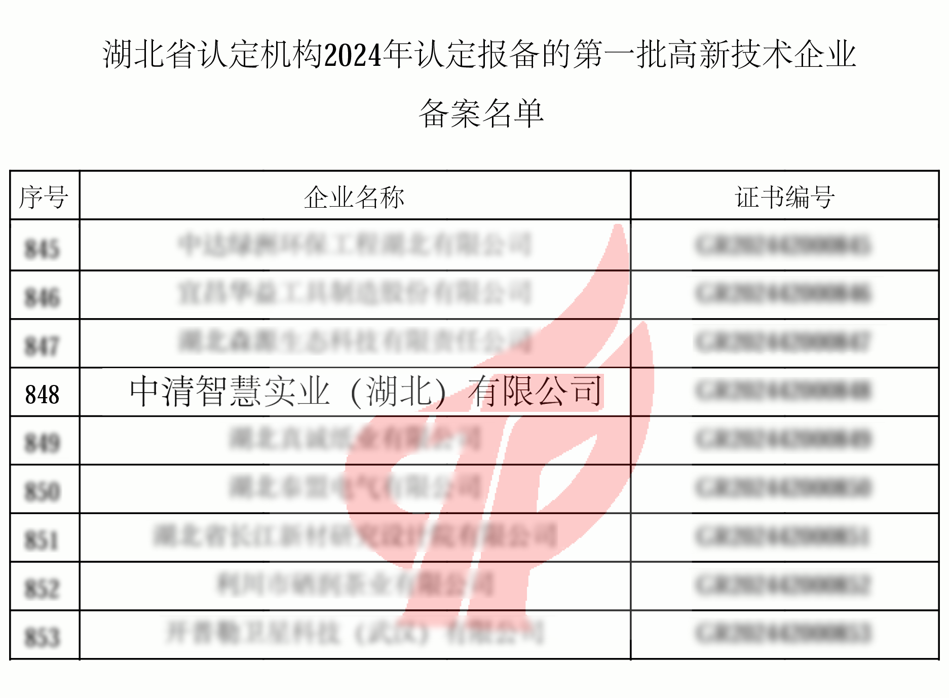 近日,全国高新技术企业认定管理工作领导小组办公室发布了《对湖北省认定机构2024年认定报备的第一批高新技术企业进行备案的公告》,中清智慧实业(湖北)有限公司名列其中,成为湖北省认定机构2024年认定报备的第一批高新技术企业。