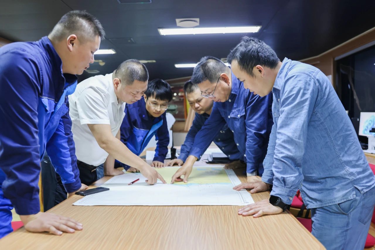 △华能临高海上风电项目建设人员正在进行海上升压站上部组块吊装桌面推演