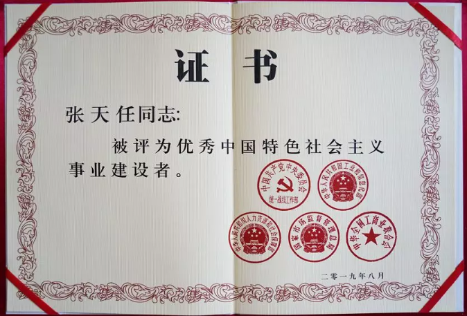 在建国70周年即将来临之际,天能集团董事局主席张天任荣获了一项国家级殊荣——优秀中国特色社会主义事业建设者。