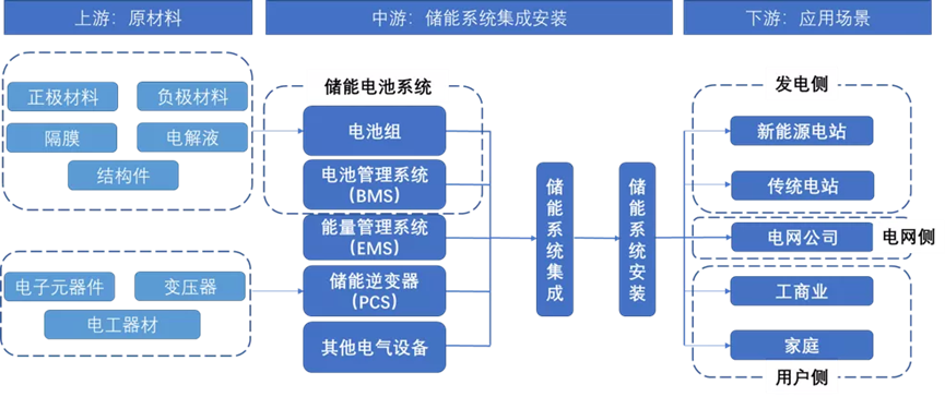 整个储能产业链条长而复杂,覆盖了从上游的元材料、器件、装备、电池研发,到系统集成,再到下游应用场景各个环节。