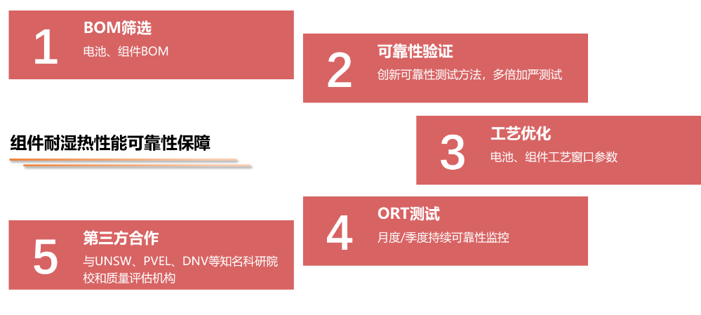阿特斯技术团队深入研究了组件湿热性能衰减机理,并与世界知名高校新南威尔士大学UNSW共同合作,发现了高效N型组件新的湿热衰减模式。基于上述深度可靠性研究工作,阿特斯在高效N型组件量产之初,就通过自主研发的可靠性保障控制程序,针对性地采取了一系列优化措施,显著提升高效N型组件的耐湿热性能: