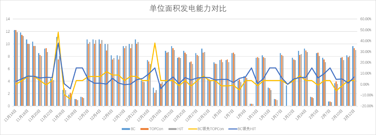 此次出炉的实证数据涵盖2024年11月中旬至2025年2月上旬的发电数据。结果表明,同等单位面积(每平方米),隆基BC二代产品实际发电能力较TOPCon高出6.67%,较HJT高出7.54%。