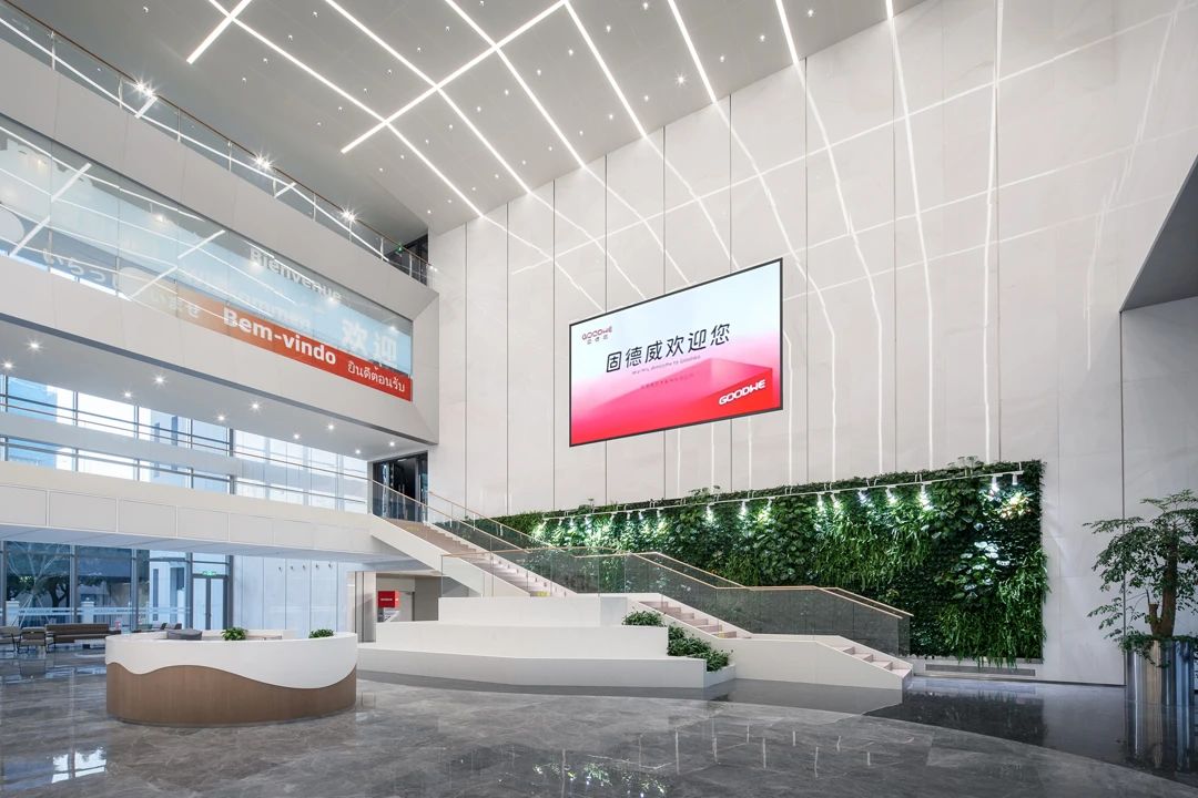 室内空间围绕“未来、科技、环保、可持续”的关键词,把概念抽象化转译后应用到空间的设计语言中,通过对材料语言和空间形态的精简,打造“简洁、智能、动静结合”的复合型空间,体现固德威绿色环保理念。