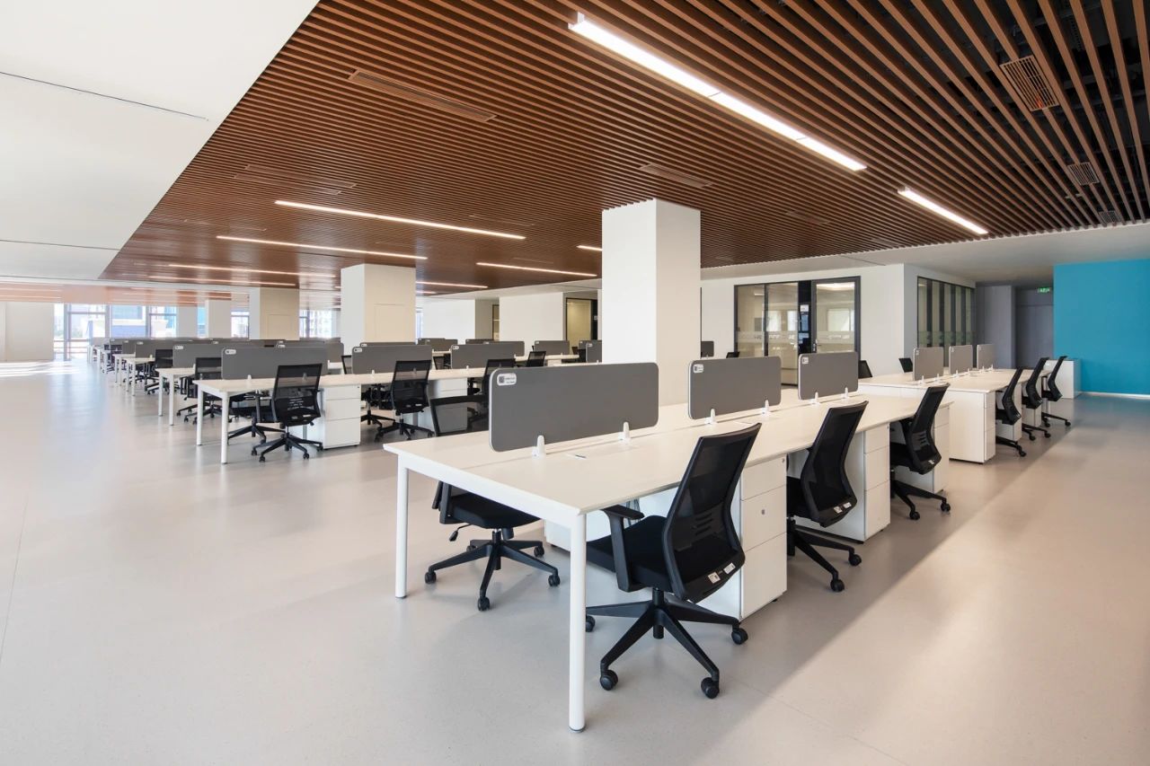 开放式办公区域,秉持极致简约与精致并存的理念,摈弃过多的装饰,少种类、色调统一的材料选择与光合二为一,深色金属成为整个空间的重色,在光影的构成下实现简约大方、沉稳宁静的办公氛围,凸显总部气质。