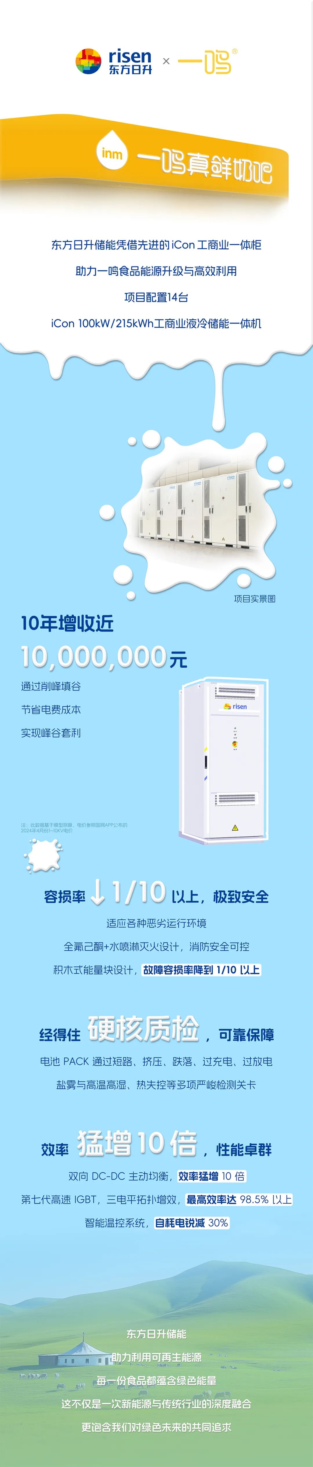在绿色能源与传统产业交融共进的当下,东方日升储能与一鸣食品携手,奏响能源升级新乐章。东方日升储能凭借先进的iCon 100kW/215kWh工商业液冷储能一体机,为一鸣食品的高效收益筑牢根基,一起来看看这场合作带来的亮眼成果!
