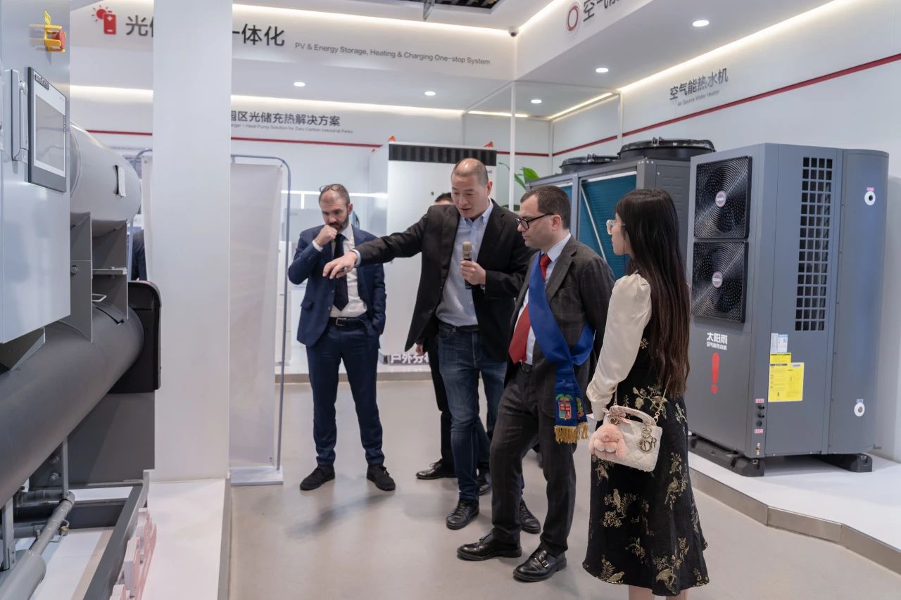 在空气能热泵展区,代表团成员驻足良久,深入了解了热泵技术在不同气候条件下的运行效能;当看到储能系统实现 "储电、储热、储冷" 全场景覆盖时,多位成员现场询问其模块化设计在既有建筑节能改造中的技术适配性。