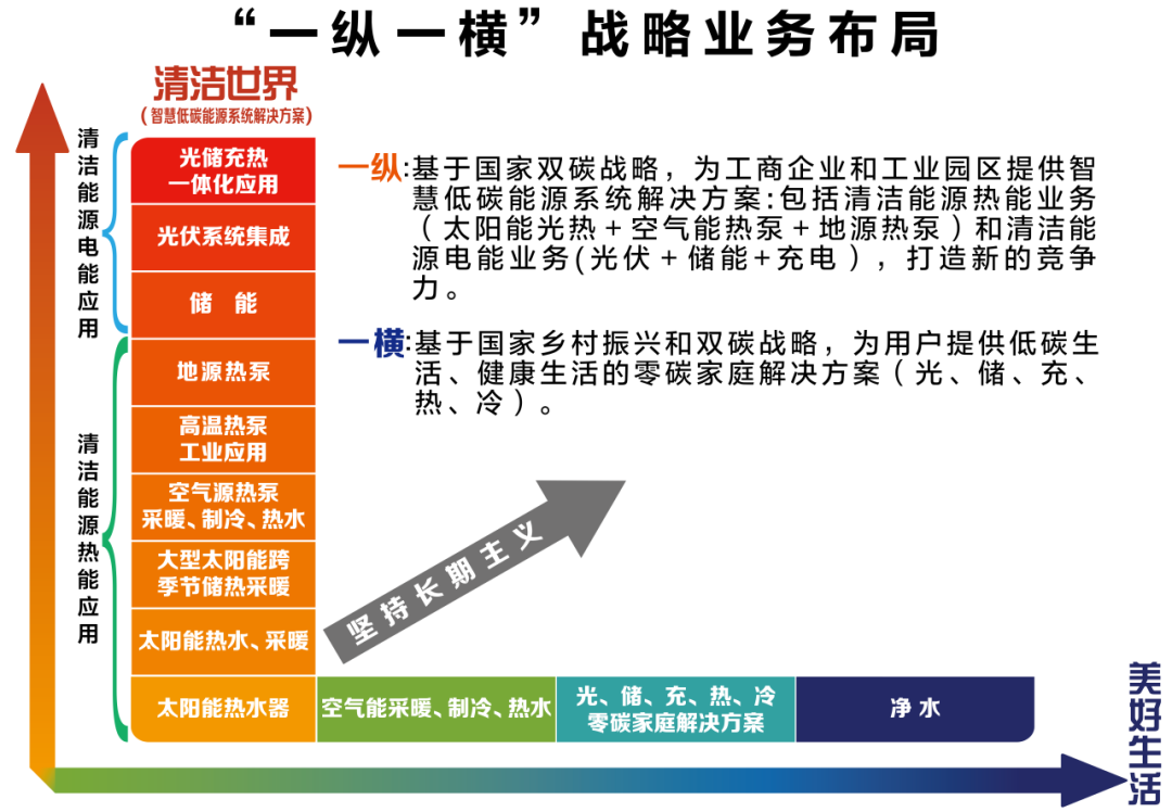 作为一家在清洁能源领域深耕20多年的企业,在深耕光热产业的同时,日出东方不断加大对空气能热泵、储能、光储充系统集成等领域的投入。经过多年的创新实践,公司形成了独具特色的“一纵一横”发展战略。