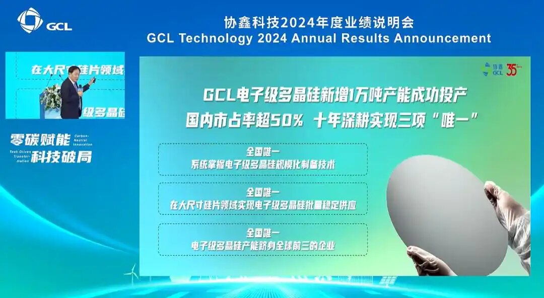 协鑫科技在年报中披露,2024年,公司新增1万吨电子级多晶硅产能已实现投产,产品国内市占率超50%,已成为国内唯一系统掌握电子级多晶硅规模化制备技术、在大尺寸硅片领域实现电子级多晶硅批量稳定供应、电子级多晶硅产能跻身全球前三的企业。