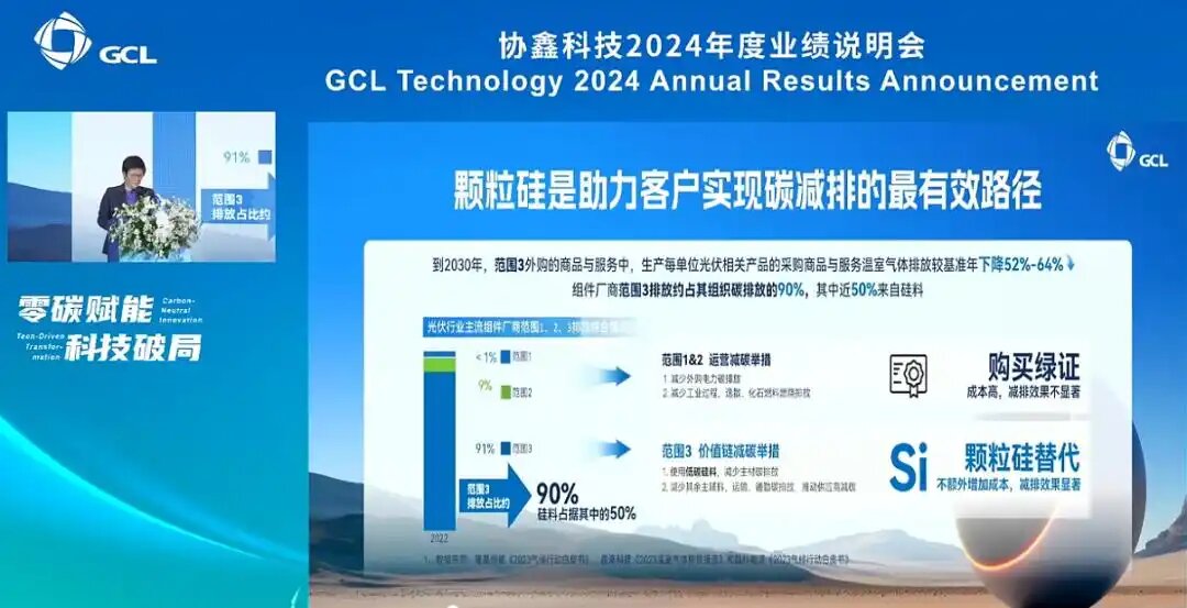 协鑫科技副总裁宋贇波介绍,在行业如此内卷之中,颗粒硅还能实现零库存,是因为下游客户光伏组件在海外销售过程中,颗粒硅的低碳竞争优势足够地强。