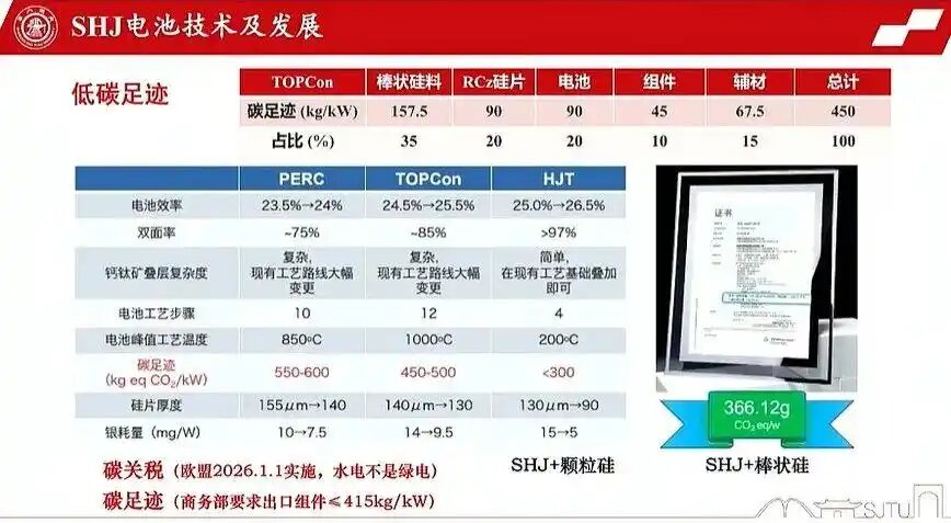 沈文忠教授表示,欧盟在明年1月1号以后将开始征收碳关税,根据碳排放强度测算,TOPCon+棒状硅,每W组件的碳税要三毛钱,异质结+颗粒硅只有两毛钱。每W售价才七毛钱的组件,光碳税就相差一毛钱。