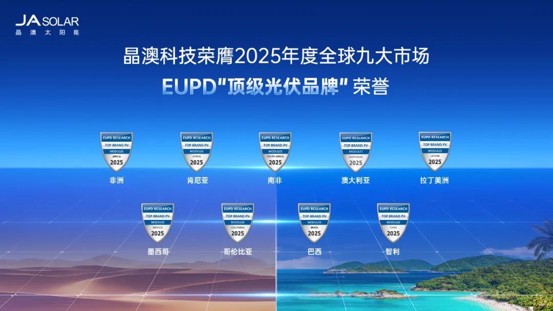 近日,晶澳科技被光伏行业权威市场研究机构EUPD Research授予2025年度“顶级光伏品牌”荣誉,涵盖非洲、拉美两大地区市场及澳大利亚、南非、墨西哥、智利、巴西、哥伦比亚、肯尼亚七个重点国家市场。