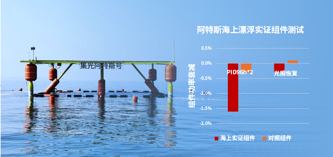 除了科学的BOM优化和严格的可靠性检验,阿特斯组件抗PID性能也经过了海上漂浮实证平台的严苛验证。该实证平台是国内首个具有自主知识产权的半潜式海上漂浮光伏发电平台,于2023年4月正式下水运行。经过长达一年以上的海上运行,在阶段性的回厂检测中,阿特斯组件各项测试数据均满足预期试验目标,其中组件复合老化后的2倍加严PID测试衰减仅约1.6%,且经过光照恢复后衰减仅为约0.3%(详见下图右)。