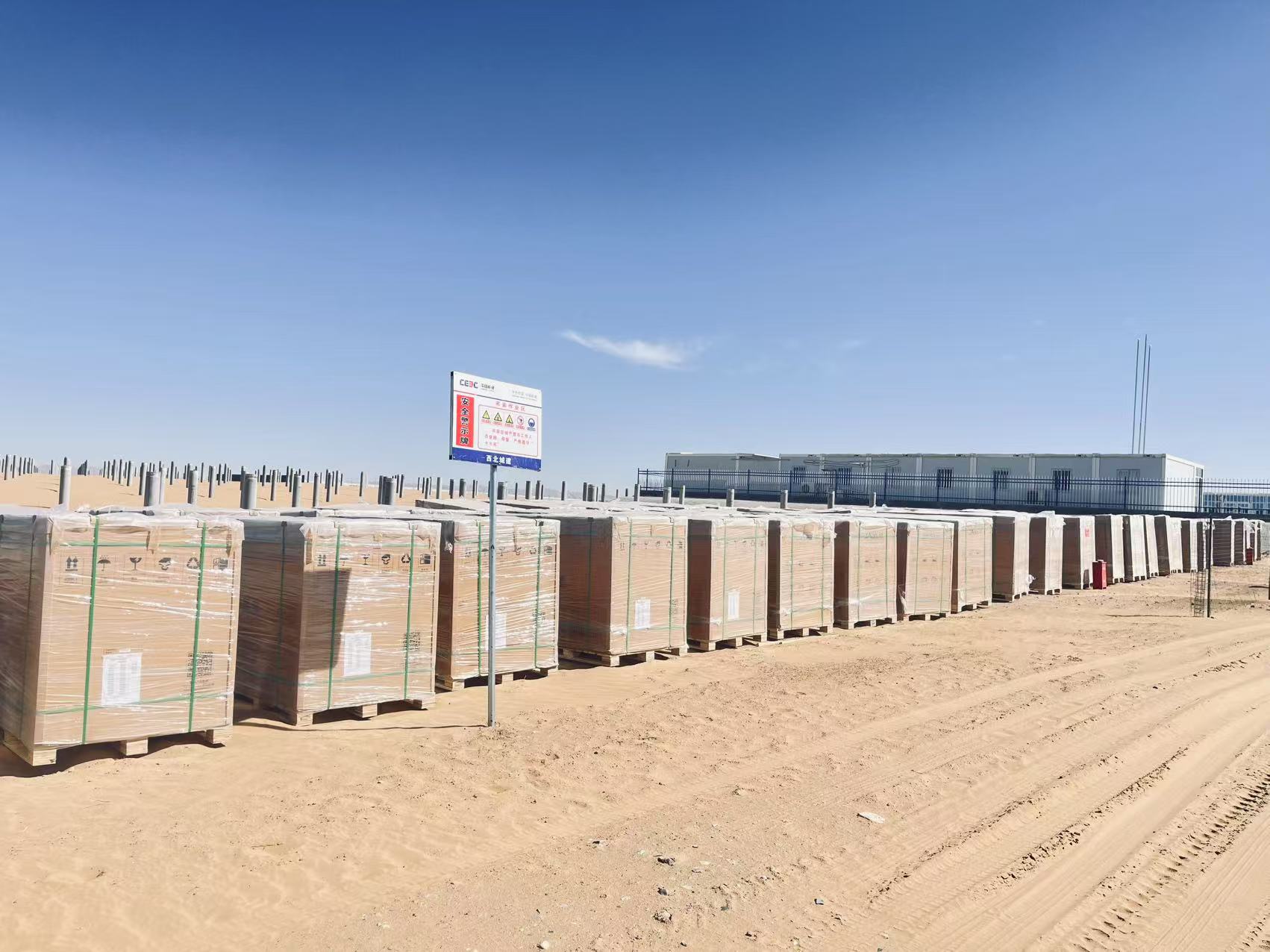 正午的额尔登布拉格苏木(苏计沙地)烈日灼沙,一根根银灰色的支架深深扎入沙地之下。这里属于内蒙古乌拉特前旗,近年来,沙漠化一直是这片土地最为困扰的问题。如今,伴随一箱箱崭新DeepBlue 4.0 Pro组件到来,这里的沉寂即将被打破。