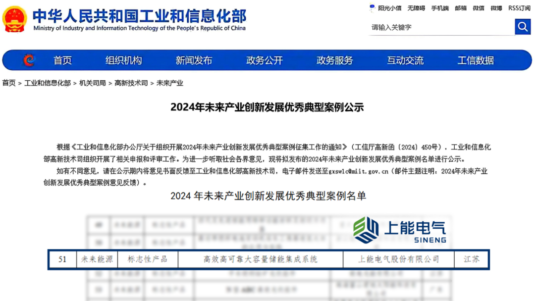 近日,国家工业和信息化部公示了“2024年未来产业创新发展优秀典型案例”名单。上能电气凭借"高效高可靠大容量储能集成系统"成功入选未来能源方向"标志性产品"名单,同时也是储能领域唯一获此殊荣的企业,这标志着公司在储能技术创新方面的领先地位再次获得国家级权威认可。