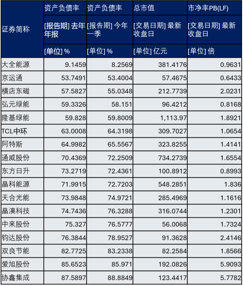 光伏主材企业负债率排名;来自WIND;赶碳号制表