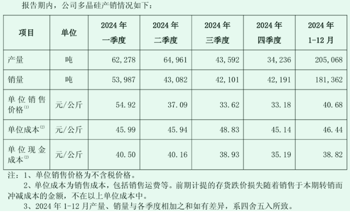 2024年,大全能源共生产20.5万吨多晶硅,销售18.1万吨,截至2024年末的库存量为2.38万吨。