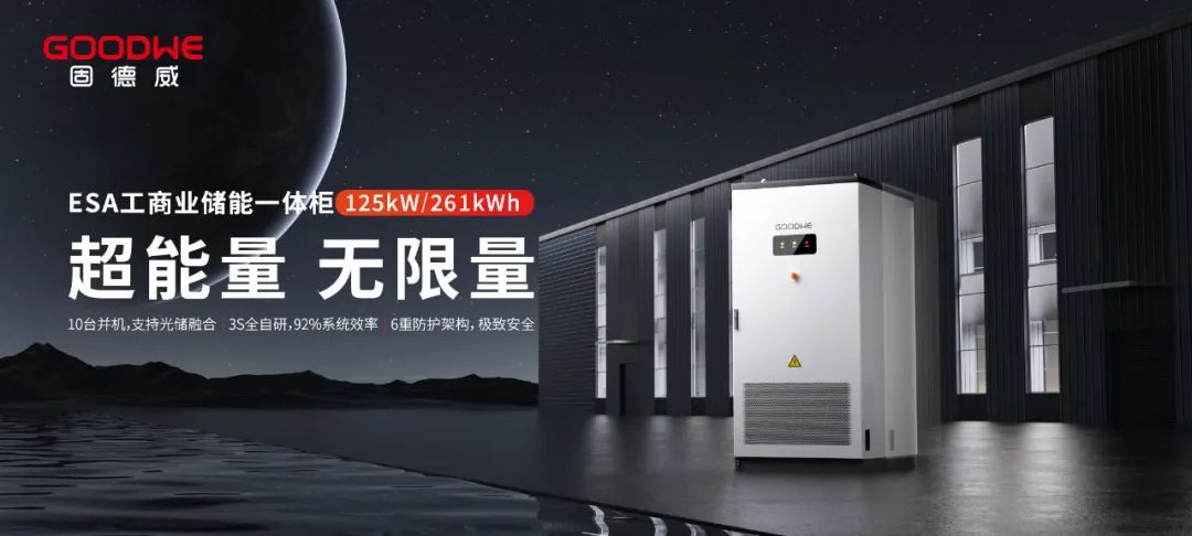 同时,固德威ESA261kWh工商业储能一体柜采用新一代314Ah高能量密度电芯,高度融合3S系统,兼具长寿命、安全与经济高效优势,支持10台机组并联,最高1.25MW/2.61MWh,根据客户需求集成不同储能系统,为用户创造更高经济收益。系统支持光储融合一体化解决方案,可智能协调光伏发电、储能充放电及负载需求,优化能源调度策略。