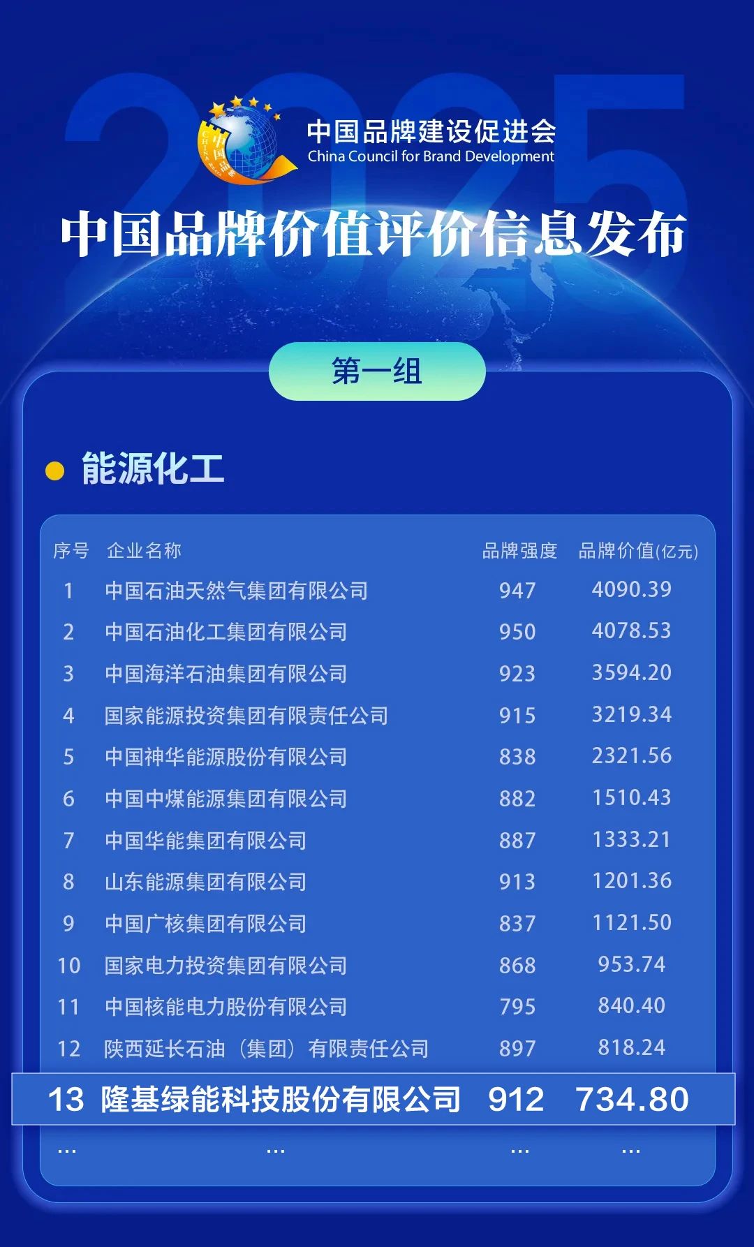 5月10日,由中国品牌建设促进会、中国资产评估协会主办,新华社品牌工作办公室、《中国品牌》杂志社等单位承办的“2025中国品牌价值评价信息”在浙江德清正式发布。榜单显示,隆基绿能品牌价值达到734.8亿元,品牌强度912,位列全国能源化工企业品牌第13位,稳居光伏行业第一。