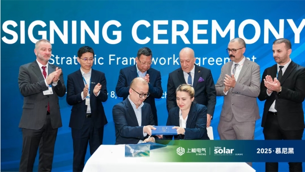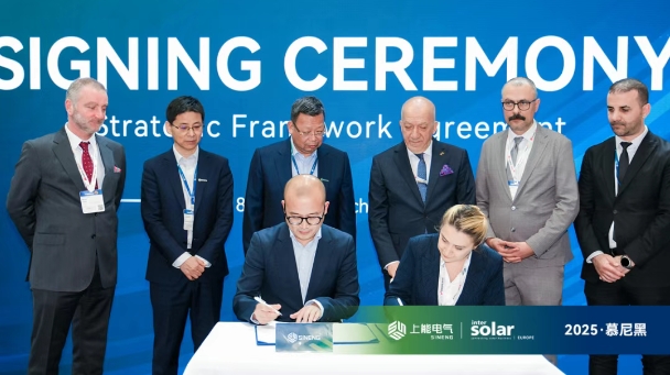 近日,在2025 Intersolar Europe展会现场,上能电气股份有限公司(以下简称“上能电气”)与土耳其知名新能源公司Europower Enerji(以下简称“Europower”)正式签署框架合作协议,进一步加速对土耳其及欧亚储能市场的开拓与布局。