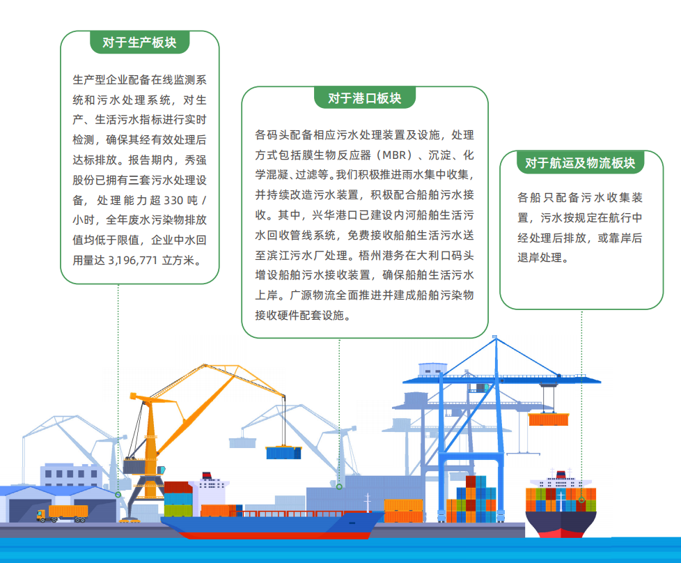 珠海港旗下秀强股份重视清洁生产,2024年开展了污染物环保检测,覆盖公司工厂的污水、废气排口取样监测点以及厂区噪声监测点。其中废气管理方面,秀强股份委托具有资质的检测机构进行一年两次的废气检测并提供报告,2024年所有检测指标均低于规定标准,符合环保要求。废水管理方面,秀强股份配备了两套与国发、省、市环保平台联网的污水在线监测系统,确保废水合规排放。