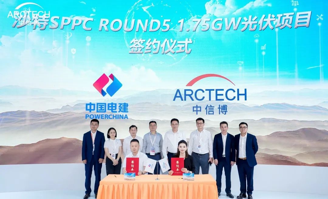 展会期间,中信博与中国电建贵州工程有限公司正式签署的沙特SPPC Round5 1.75GW项目订单。中国电建贵州工程有限公司副总经理余豪、总会计师高昱、国际工程公司总经理穆晓庆,中信博董事长蔡浩、高级副总裁周石俊等共同见证签约,中国电建集团贵州工程有限公司副总经理闫建国、中信博中国区总裁郭菲分别代表双方签署协议。