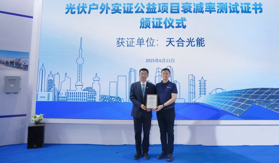 在CPVT宁夏银川实证基地——这一具有典型干旱、半干旱气候特征的严苛测试场,因该地区阳光充足,太阳辐射强烈,昼夜温差较大,对光伏组件的性能和衰减率具有较大影响,是测试验证组件抗UVID和LID性能的理想场所之一。天合光能至尊N型组件在为期一年的户外实证测试中,平均衰减率仅为0.51%,显著优于行业普遍的1%质保承诺。CPVT特此为天合光能颁发“光伏户外实证公益项目衰减率测试证书”,对至尊N型720W系列组件在实际户外应用时表现出的卓越的产品性能表示高度认可。