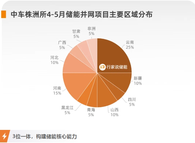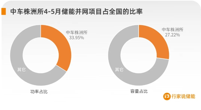 根据行家说储能统计的4-5月全国储能并网数据,中车株洲所并网储能项目功率占比达33.95%,容量占比达27.22%。这一领先的市场份额,主要得益于中车株洲所在储能领域强大的市场拓展与拿单能力。