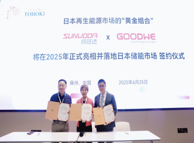固德威副总裁王英歌与欣旺达海外储能负责人蔡旺林表示,将凭借高可靠性、智能化的产品和系统解决方案,深度融入日本市场,致力于助力日本提升绿电消纳能力、保障能源稳定供应,共同推动产业升级。