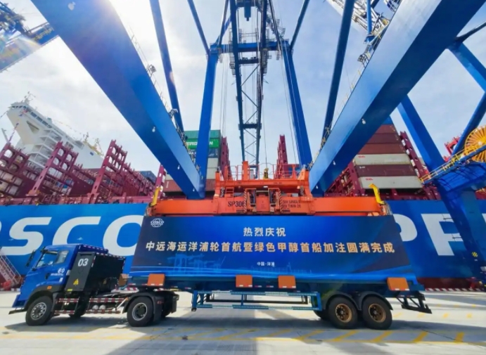 7月2日,我国首艘甲醇双燃料动力、集装箱船“中远海运洋浦”轮,首航海南省洋浦港,并在洋浦国际集装箱码头,完成首次国产绿色甲醇加注。