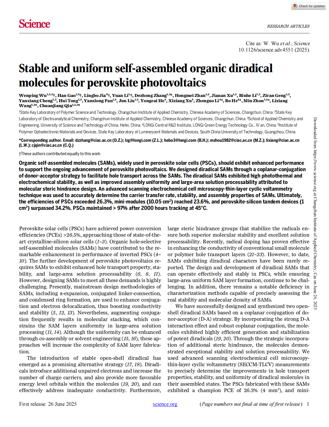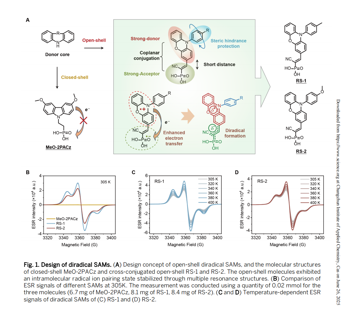此前不久,隆基绿能联合中国科学院长春应用化学研究所等研究团队,通过采用给受体共轭策略,成功开发了一种具有开壳双自由基的新型有机自组装分子。该分子展现出优异的载流子传输能力、在实际工况下的优异结构稳定性以及卓越的组装均匀性,使得基于该材料的钙钛矿太阳能电池在效率和稳定性方面均取得了显著进展。相关研究成果以《Stable and uniform self-assembled organic diradical molecules for perovskite photovoltaics》为题,于2025年6月26日发表于国际顶级学术期刊《Science》上。