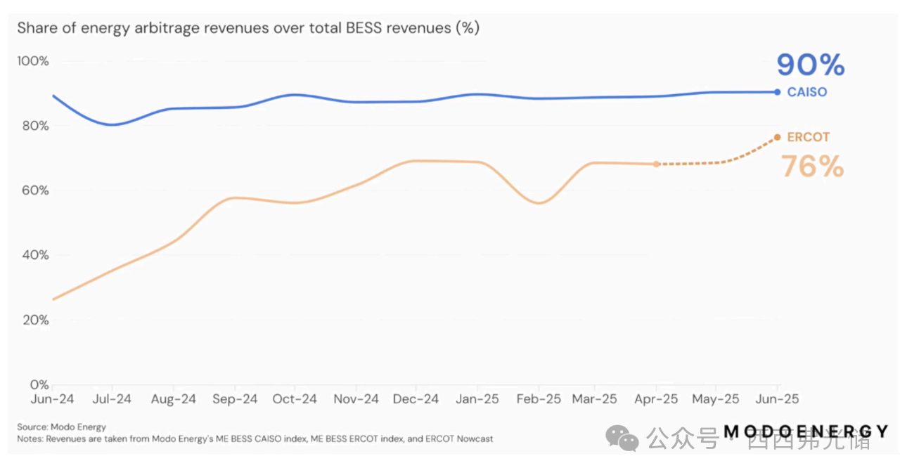 在过去12个月里,能量套利在ERCOT储能收入中的占比从25%飙升至76%,而辅助服务的价值则相应缩水。这标志着市场策略已从依赖辅助服务转向捕捉能量市场的价差机会。