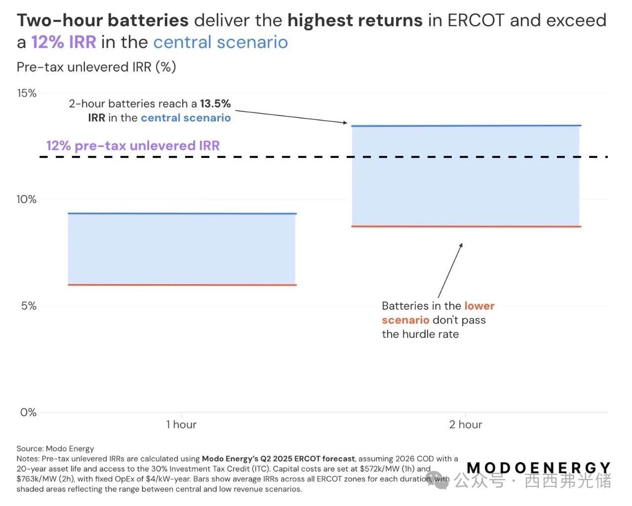 尽管市场火热,但2025年第一季度的储能收入却是过去四年来的最低点,同比下降超过40%。这直接归因于套利空间的收窄。在此背景下,两小时储能系统的战略优势愈发凸显。相比一小时系统,两小时系统具备更高的运营灵活性,能更好地平衡日前和实时市场的风险与收益,避免因电量不足而在价格飙升时被迫高价回购电力,从而实现更高的内部收益率(IRR)预期(两小时系统为13.5%,一小时为9.4%)。