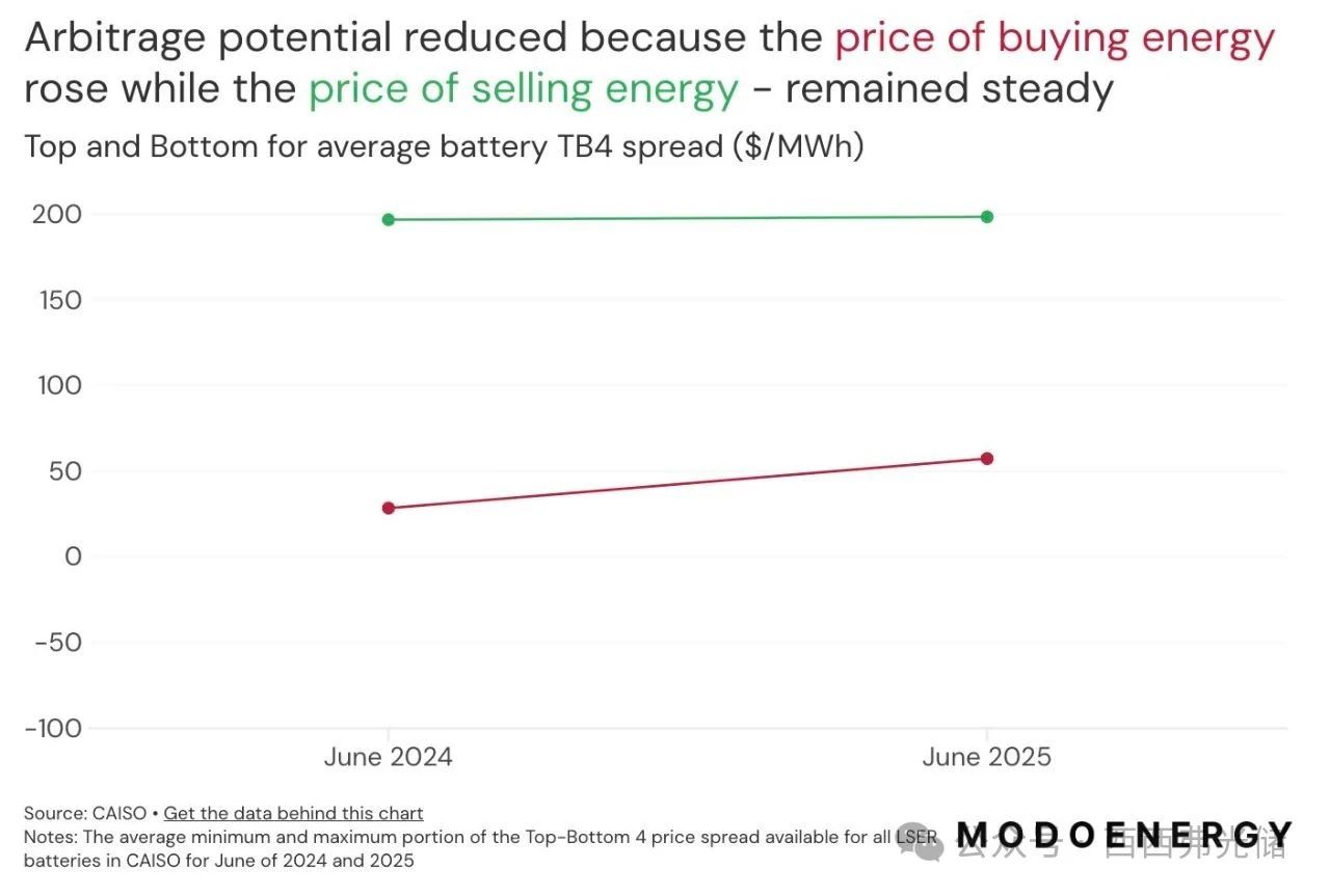 与ERCOT类似,CAISO的储能系统也正在改变电价形态。由于大量电池在正午时段集中充电(高峰充电负荷从4.2GW增至6.1GW),有效吸收了过剩的光伏发电,使得日间最低电价几乎翻了一番。这导致四小时平均能量价差同比下降了21%。