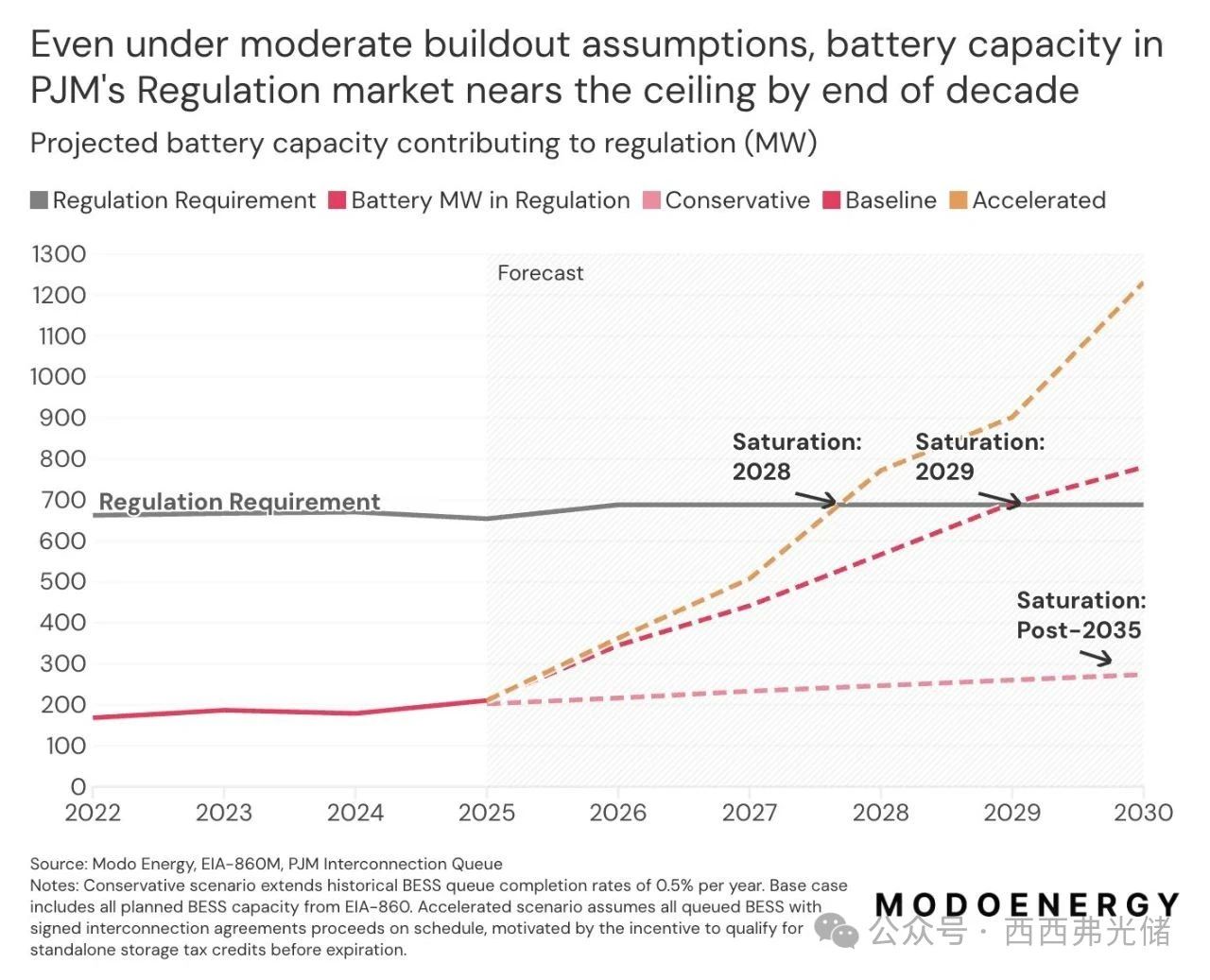 然而,随着越来越多的储能进入,市场饱和的风险日益临近。根据不同的建设速度情景分析,调频市场可能在2028年至2035年之间达到饱和。