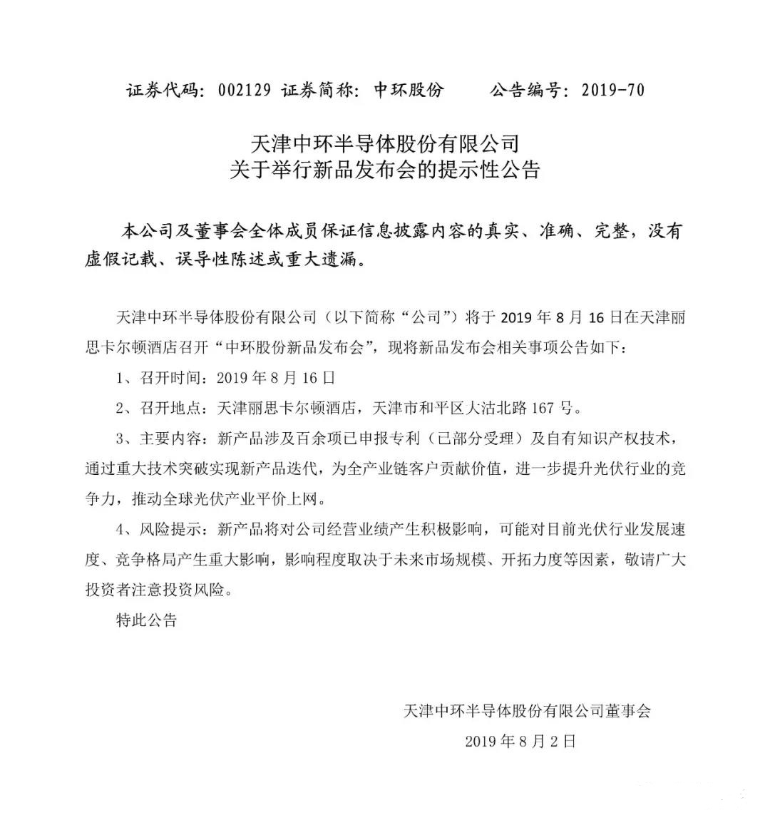 中环股份8月2日午间发布公告称,公司将于2019年8月16日在天津丽思卡尔顿酒店召开“中环股份新品发布会”,午后中环股份强势涨停!