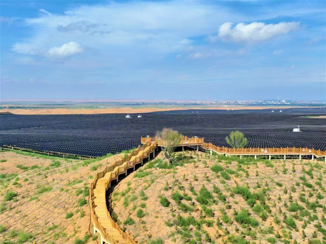 宁夏腾格里“沙戈荒”新能源基地有着非同一般的“身份”,它是国家发改委和国家能源局“双批复”的首个“沙戈荒”能源大基地,是国家千万千瓦级“沙戈荒”基地中首个备案、开工、投产的项目,还是国家第一条以开发沙漠光伏大基地、输送新能源为主的特高压输电通道——“宁湘直流”工程的重点配套项目,创下了我国沙戈荒大基地开发史上的三项“全国之首”。