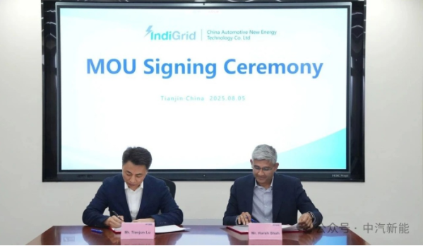 近日,中汽新能与印度最大的电力部门基础设施投资信托公司IndiGrid在天津总部签署2026-2027年储能系统产品5GWh合作备忘录。