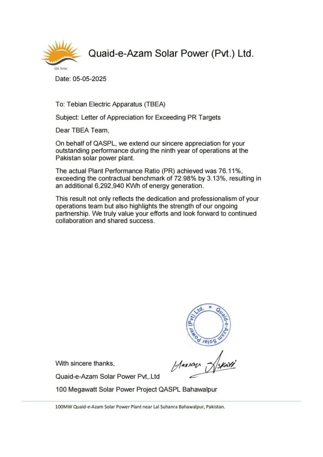 历经十载春秋的稳健运行,由特变电工新能源承建并运维的巴基斯坦100MWp并网光伏电站再次被评选为5A级“优胜光伏电站”。