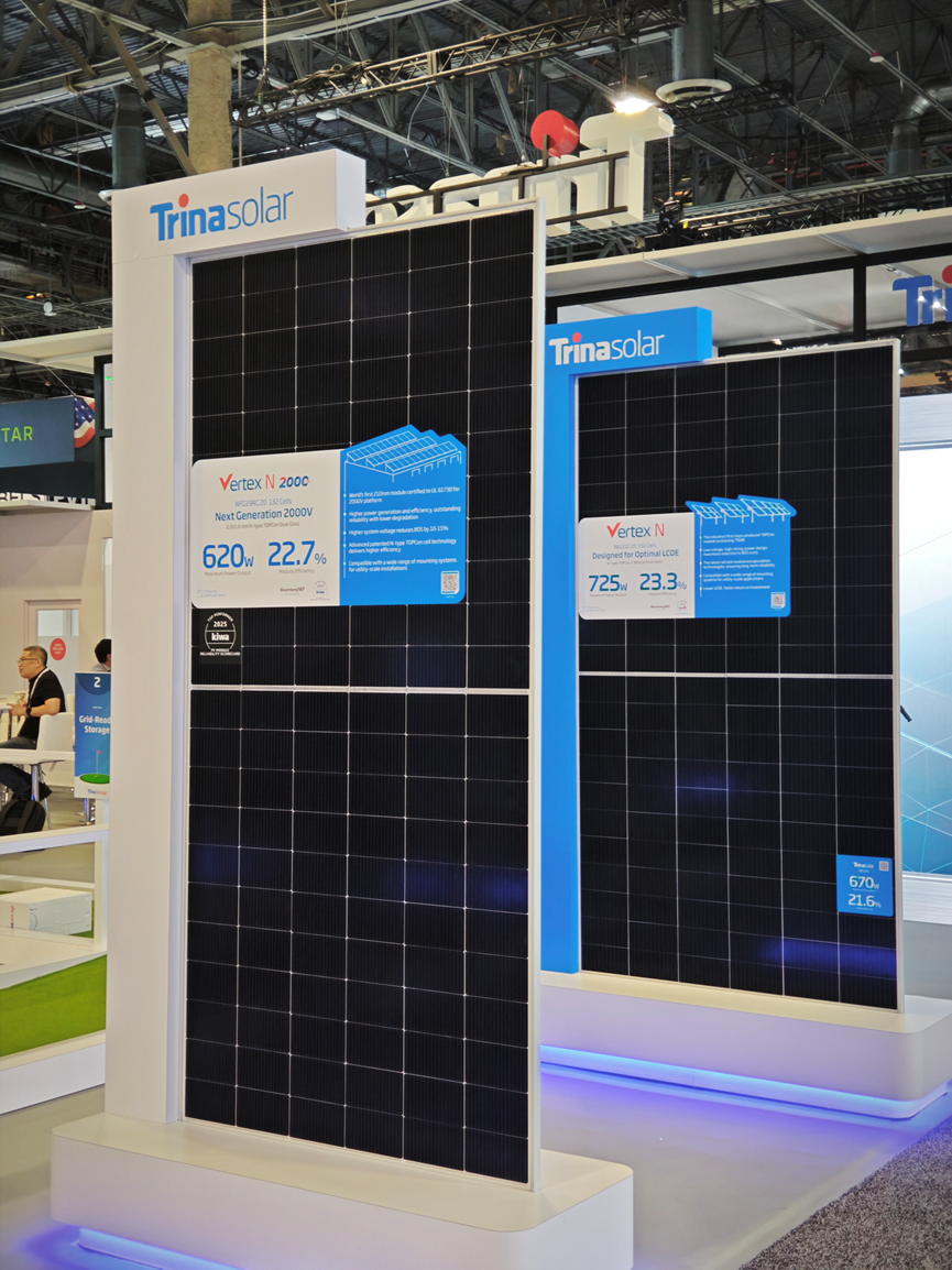 与此同时,面向工商业及分布式市场,天合光能展出高抗风载至尊N型小金刚组件。 该产品采用强化钢化玻璃与加固黑色边框设计,在抗风压(5400Pa)与抗冰雹(直径45mm)方面具备优异表现,为用户带来兼具美观与可靠性的解决方案。另外,展会现场重磅亮相的至尊N型2000V高压组件同样备受关注。该产品凭借高功率输出、高系统电压和卓越可靠性表现,荣获全球首张210系列组件UL 61730 2000V认证证书,充分满足北美市场多元化需求。