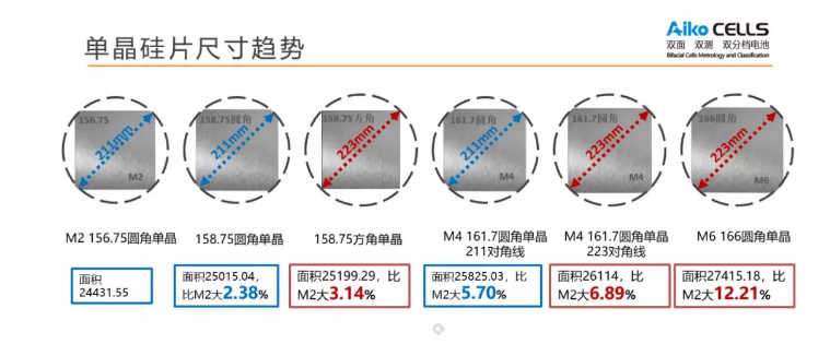 大尺寸电池的出现是平价上网时代的选择,在2008年以前,单晶硅片由边距125mm小尺寸逐渐增大转向156mm,2013年后,156.75尺寸凭借其不改变组件尺寸可提高封装功率的优势迅速成为行业主流且稳定了数年时间。而2018年下半年,基于对高功率组件的迫切需求,希望以更大的受光面积提高组件封装瓦数,158.75mm、161.7mm和更大尺寸的166mm产品也逐渐问世。