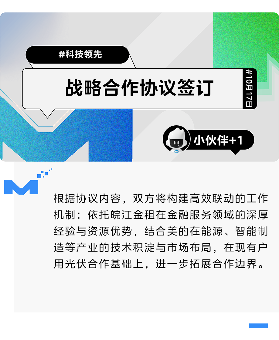 根据协议内容,双方将构建高效联动的工作机制:依托皖江金租在金融服务领域的深厚经验与资源优势,结合美的在能源、智能制造等产业的技术积淀与市场布局,在现有户用光伏合作基础上,进一步拓展合作边界 —— 不仅将深化 “交通 + 新能源” 场景应用、新能源全产业链协同、技术与平台共建、区域市场联动,还将延伸至工业机器人、高端装备制造等领域,推动多维度价值共创,释放产业融合新动能。