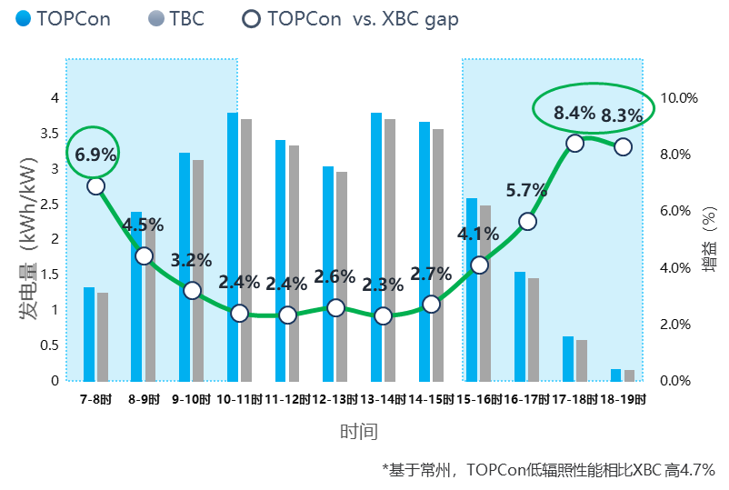 136号文件的出台对光伏组件的发电能力提出了新要求,组件中午的高发电时段恰逢电价洼地,组件在晨昏高电价时段发挥高发电能力的重要性由此凸显。通过江苏常州的实证可以看出,TOPCon组件相较XBC组件拥有更优的弱光性能:在200W/㎡及以下辐照环境条件下,TOPCon组件的发电量优势超过XBC组件7%以上,其单瓦发电能力在晨昏高电价时段尤为明显,较TBC组件高6.9%~8.4%,在市场化电价机制下,可为客户带来更高发电收益。