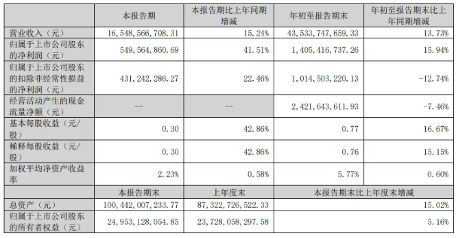 从单季度看,第三季度营收165.49亿元,同比增长15.24%;净利润5.5亿元,同比增长41.51%,保持较高增速。