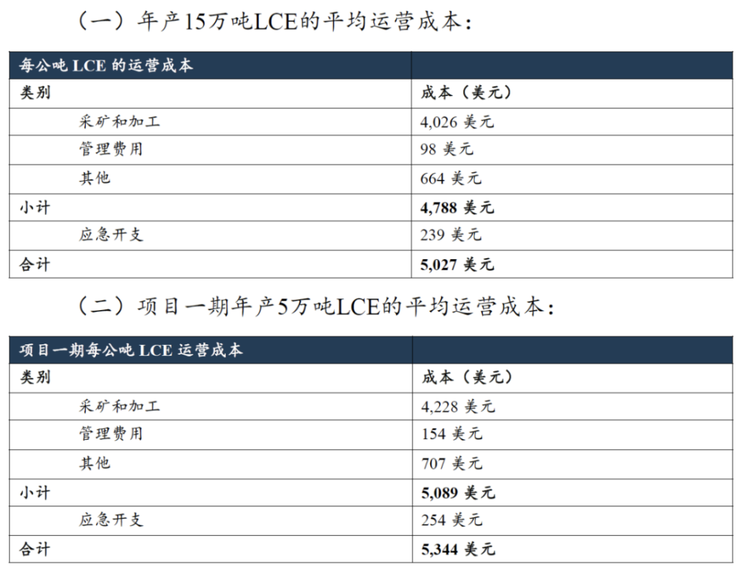 项目可研评估显示,PPGS锂盐湖项目设计年产能约为15万吨LCE,分三期建设,项目寿命为30年。测算年产15万吨LCE的平均运营成本为5027美元,项目一期年产5万吨LCE的平均运营成本为5344美元。