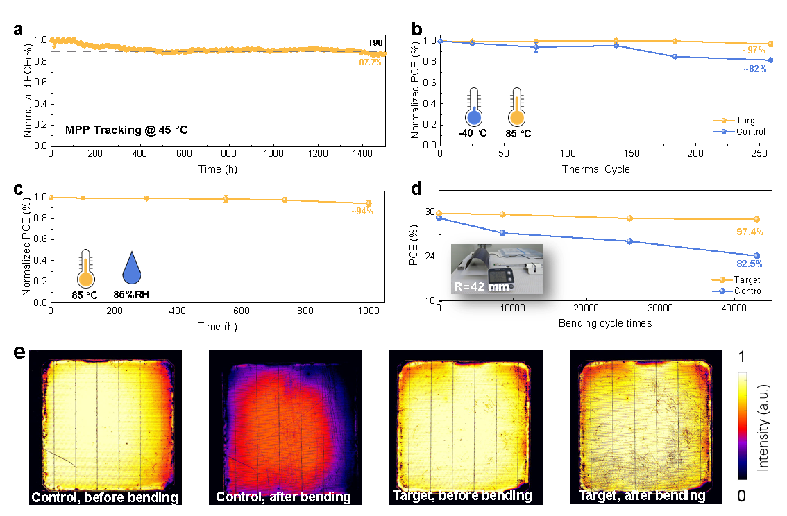 为了解决这一问题,团队采用创新优化的工艺结构设计,构建出疏松加致密的双层缓冲层设计,精心设计的疏松SnOx层能像弹簧床垫一样吸收和耗散应变能,有效缓解制备过程中离子轰击和后续使用中形变带来的机械应力;而致密的SnOx层可确保高效的界面电荷提取和稳固的电学连接。